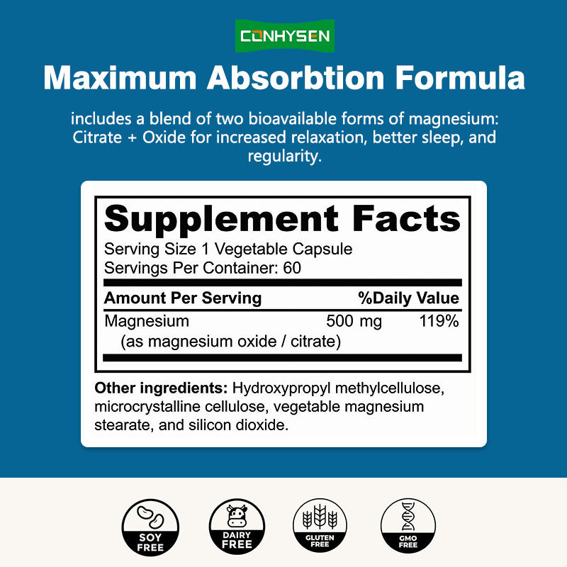 Kapsul magnesium adalah suplemen makanan yang terutama terdiri dari unsur magnesium atau senyawa magnesium, yang bertujuan untuk menyediakan tubuh dengan magnesium mineral yang diperlukan.Sebagai kation utama keempat dalam tubuh manusia, magnesium memainkan peran penting dalam lebih dari 300 reaksi biokimia, berpartisipasi dalam proses fisiologis penting seperti metabolisme energi, sintesis protein, dan transmisi sinyal saraf.Kapsul magnesium mengkapsulkan berbagai bentuk garam magnesium, seperti magnesium oksida, magnesium sitrat, dan magnesium glisin, dalam kapsul,menyediakan cara yang nyaman dan efisien untuk menambah magnesium bagi orang yang tidak memiliki asupan magnesium yang cukup karena diet monoton atau kebutuhan fisiologis khusus.