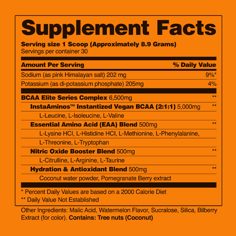 Bahan:Sodium, Kalium, BCAA Elite Series Complex, BCAA Vegan Instansi, Campuran Asam Amino Esensial, Campuran Nitric Oxide Booster, Campuran Hidrasi & Antioksidan