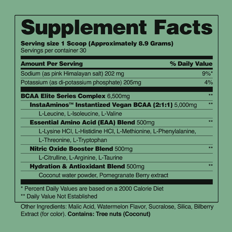 Bahan: Sodium, Potassium, Kompleks BCAA Elite Series, BCAA Vegan Instan, Campuran Asam Amino Esensial, Campuran Peningkat Nitric Oxide, Campuran Hidrasi & Antioksidan