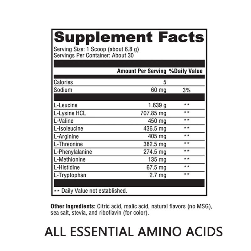 L-Leucine, L-lsoleucine, L-Valine, L-Lysine HCL, L-Arginine, L-Threonine, L-Phenylalanine, L-Methionine, L-Histidine, L-Tryptophan