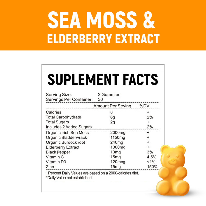Sea Moss Irlandia Organik, Vitamin C, Vitamin D3, Seng, Bladderwrack Organik, Akar Burdock Organik, Ekstrak Elderberry, Lada Hitam