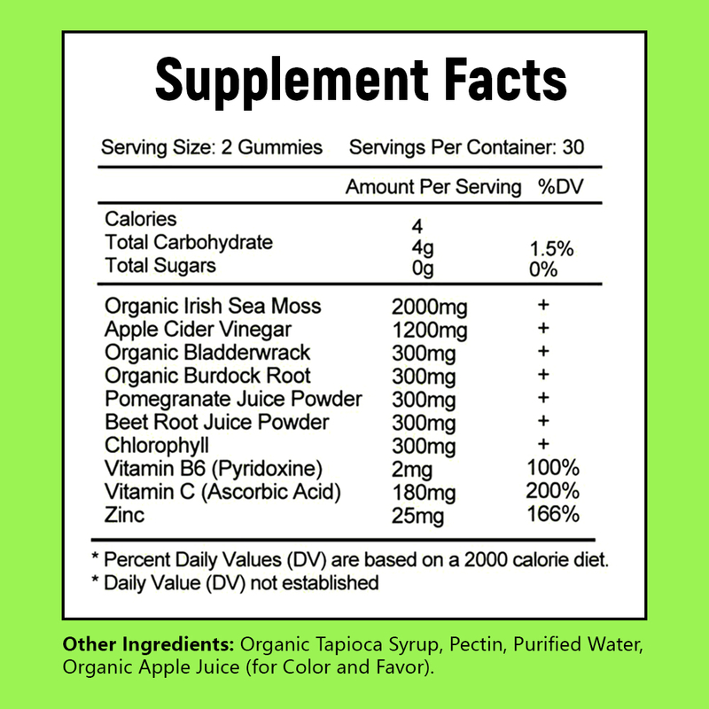 Lumut Laut Irlandia Organik, Bladderwrack Organik, Akar Burdock Organik, Cuka Sari Apel, Bubuk Jus Delima, Bubuk Jus Bit Merah, Seng, Vitamin B6, Vitamin C, Klorofil