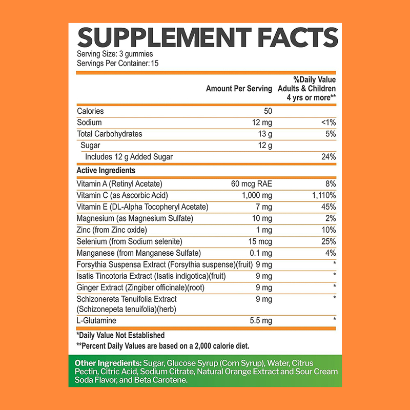 Vitamin C, Vitamin A, Vitamin E, Seng, Magnesium, Selenium, Mangan, Ekstrak Jahe, Ekstrak Forsythia Suspensa, Ekstrak Isatis Tincotoria, Ekstrak Schizonereta Tenuifolia, L-Glutamin