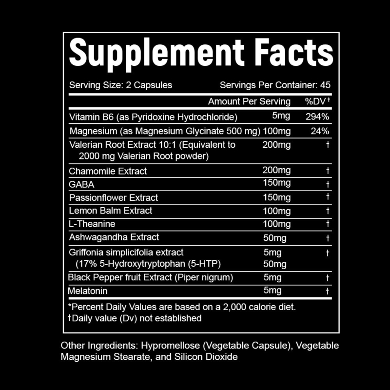 Vitamin B6, Magnesium, Ekstrak Akar Valerian, Ekstrak Chamomile, GABA, Ekstrak Passionflower, Ekstrak Lemon Blam, L-Theanine, Ekstrak Ashwagandha, Ekstrak Griffonia Simplicifolia,Ekstrak Buah PepperMelatonin