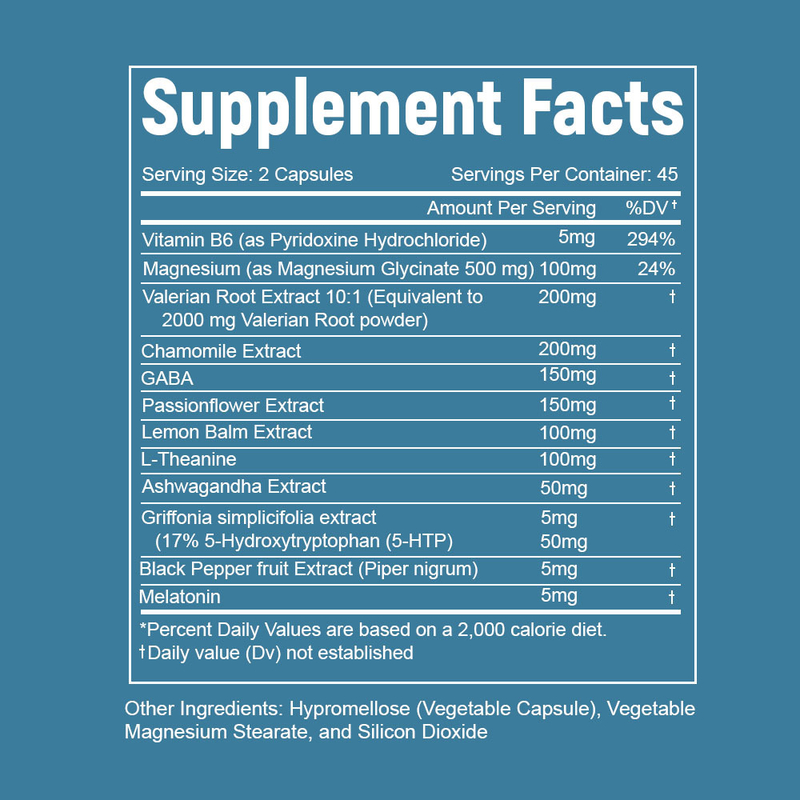 Vitamin B6, Magnesium, Ekstrak Akar Valerian, Ekstrak Chamomile, GABA, Ekstrak Passionflower, Ekstrak Lemon Blam, L-Theanine, Ekstrak Ashwagandha, Ekstrak Griffonia Simplicifolia,Ekstrak Buah PepperMelatonin