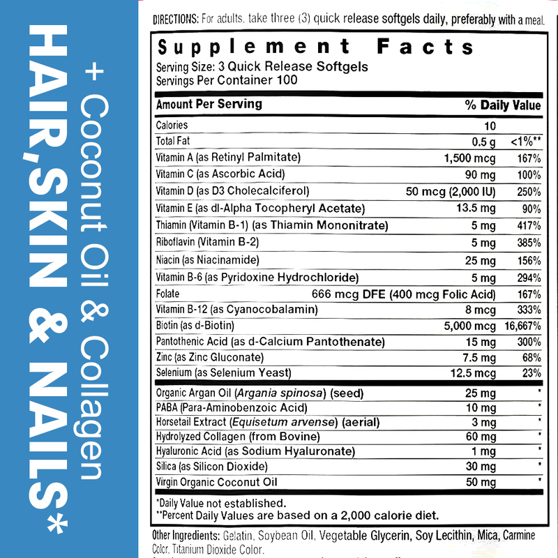Multivitamins, Organic Argan Oil, PABA, Hydrolyzed Collagen, Virgin Organic Coconut Oil, Silica, Zinc, Biotin